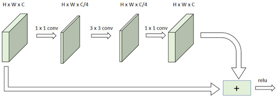 To solve the above problems, the D-MFPN uses resnet-50 as a backbone. The CNN structure independently extracts the features of the labeled data, effectively avoiding the traditional complex feature design. The residual block module also prevents overfitting and vanishing gradient problems, greatly increasing the network depth. The residual structure of resnet50 consists of multiple structures called a “bottlenet” (as shown in Figure 2), and finally, five feature maps of different scales (conv1, conv2, conv3, conv4, conv5) are obtained.