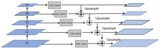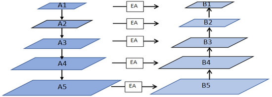 As shown in Figure 5, the location information of the bottom of the pyramid is transferred to the top (B5 → B4 → B3 → B2 → B1). In this way, the high-level feature map will contain more location information, which will improve the feature expression ability of large ships to a certain extent. In addition, before downsampling, the low-level feature maps are refined by EA, which improves the effect of upsampling.