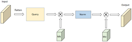 Figure 4 shows the implementation process of EA. In order to also make the attention mechanism consider the influence from other samples, EA designs two feature layers shared by all samples, and . First, in the same way as the self-attention mechanism, the input feature map F is flattened as a query and then multiplied with the matrix using softmax normalization to obtain the correlation matrix between query and key. Finally, the same operation is performed with to obtain the output. The formula for this process is as follows: