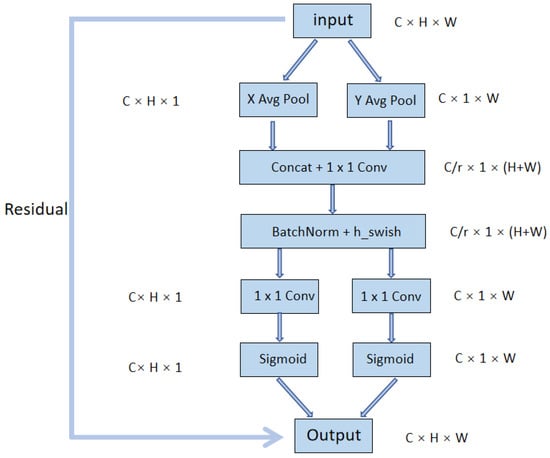 where represents the concatenation along spatial dimension; denotes the h_swish activation function; the shape of output f is (C/r,(H + W)); and r is the reduction ratio for controlling the block size as in the SE block. Then, we decompose f into components in the h and w directions and go through another 1 × 1 convolutional layer to turn it into a tensor with the same number of channels as the input X: