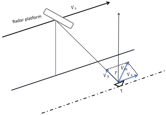 The geometric relationship between the satellite and target moving in the direction of is shown in Figure 7, where T represents the target point. According to the spaceborne SAR echo theory, the distance history of the stationary target T can be obtained as: