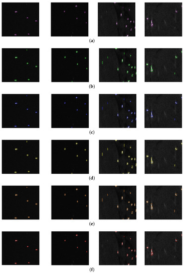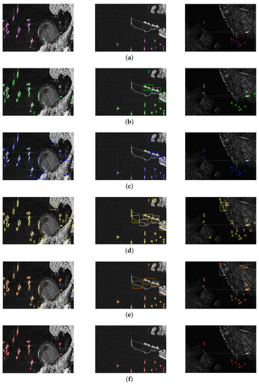 As can be seen in Figure 12, after adding a large number of defocused ship slices with insignificant geometric features, other detection models become unusually sensitive to ship-like noise and island regions. In Figure 12b–e, the other four algorithms mistakenly detect the noise and island parts in the background as targets, and the overall network has a low degree of discrimination for the ship area. The loss of accuracy caused numerous false alarms, while on the other hand, the D-MFPN successfully detected almost all pictures, even in the case of strong noise interference or low signal-to-noise ratio, which shows that the D-MFPN is very suitable for the ship area and has sharp judgment and robust noise reduction performance. In Figure 12f, compared with other methods, the D-MFPN strengthens the feature structure and can effectively distinguish dense ship features. After adding the doppler domain features, an enhanced judgment ability of defocused pixel blocks is obtained that is less sensitive to defocusing-like areas. Based on the above, the D-MFPN achieves the best performance among all algorithms in the marine background.