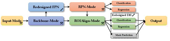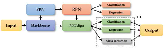 Figure 1 is Mask R-CNN’s framework. Mask R-CNN is Faster R-CNN’s extended version. By contrast, it adds a mask prediction branch to its DH. The proposals from RPN are mapped into the backbone to extract ROI features twice. One extraction is for classification and regression, and the other is for segmentation. ROIAlign was used to replace ROIPool [] to remove misalignments between the ROIs and extracted features. FPN [] was applied to Mask R-CNN for better multi-scale segmentation. Mask R-CNN refers to its FPN version in this paper. Mask R-CNN is a main-stream two-stage instance segmentation framework in the CV community, so it is selected. We refer readers to Ref [] for more details.