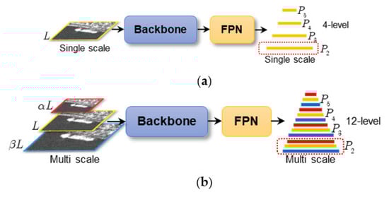 The input mode can be counted as a multi-scale training test []; it is yet endowed with a new idea, i.e., establishing multi-scale inputs in a single scale. It can solve cross-scale detection (targets have a large pixel scale difference []). The large scale difference is often due to the large resolution difference [,]. Figure 3 is the input mode’s sketch map. Figure 4 represents the cross-scale ships in SSDD.