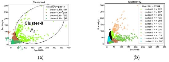 If the single scale is L in Figure 3a, then the raw FPN scales are L/4, L/8, L/16, and L/32 in P2, P3, P4, and P5; therefore, four levels are used for multi-scale detection. Yet, using four levels, it is still difficult to perform cross-scale detection, according to the K-means clustering results in Figure 5a. For example, P5 should be responsible for detecting large ships in Cluster-0, but the scale difference is too large in Cluster-0 (loose distribution). With the input mode, the input scales are αL, L, and βL in Figure 3b. The sequence 0 < α < 1 is used to improve the regression of large ships (i.e., shrinking), and β > 1 is used to detect smaller ships (i.e., stretching). The 3-level image pyramid equivalently sets up a 12-level feature pyramid (4 × 3). Intuitively, 12 levels should be better than the 4 ones from the mean intersection over union (IOU) [] in Figure 5 (0.7344 > 0.5913). Note that the equivalent 12-level FPN is in fact virtual and has the same parameter quantity as the 4-level one. One can up- or down-sample the 4-level FPN to build a real 12-level one, but this must increase the parameters and calculation costs. We set L, α, β to [512, 0.8125, 1.1875] on SSDD empirically. They are [1000, 0.80, 1.20] on HRSID. We set three scales for accuracy–speed trade-offs. More scales might obtain better accuracy but must sacrifice speed. In Section 5, we will conduct experiments to study the impact of input scales on accuracy and speed.