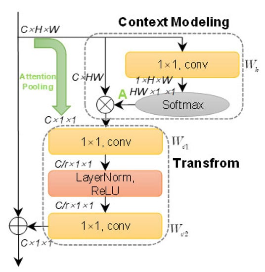 Figure 9 is GCB’s implementation. C is the channel number; H and W denote spatial sizes. GCB has a context modeling module and a transform one. The former adopts 1 × 1 conv Wk and softmax to generate attention weights A and conducts global attention pooling to obtain the global context features (from C × H × W to C × 1 × 1). This is equivalent to the global average pooling (GAP) [] in squeeze and excitation (SE) [], but the average form is replaced by an adaptive attention weighted form. The latter is similar to SE, but before the rectified linear unit (ReLU), the output of the 1 × 1 squeeze conv Wv1 is normalized to enable better generalization, equivalent to the regularization of batch normalization (BN) []. To refine the more salient features of three parallel differently shaped convs, the squeeze ratio r is set to 3. The last 1 × 1 conv Wv2 is used to transform the bottleneck to capture channel-wise dependencies. The element-wise addition is used for feature fusion. The above is described by
