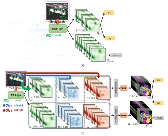 For the ROI with a (w × h) size, the ROI mode adds two-level context information, denoted by ROIC1 with a λ(w × h) size marked in blue in Figure 11b and ROIC1 with a μ(w × h) size marked in red in Figure 11b, respectively. We only add two extra contextual ROIs considering a trade-off between accuracy and speed. λ > 1 and μ > 1 mean enlarging the ROI to receive external surrounding context information. λ is set to 2, and μ is set to 3, empirically. Note that Kang et al. [] also added context information, but multi-level contexts were not considered. The ROIAlign outputs of three-level ROIs are concatenated directly. To avoid possible training oscillation due to injecting too many irrelevant backgrounds, we use SE to refine the features and then apply a feature dimension reduction (256 × 3→256), i.e., suppressing useless information and highlighting valuable one. We modify the raw SE to make it possess the function of dimension reduction (DR). The modified version is named DRSE. DRSE not only reduces the computational burden on the backend but also ensures a seamless connection to the follow-up box classification regression and mask prediction branches, avoiding troublesome interface designs. To sum up, the above is described by