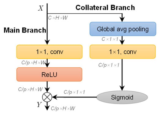 Figure 12 is DRSE’s implementation. In the collateral branch, GAP is used to obtain global spatial information; 1 × 1 conv and the sigmoid function are used to squeeze the channels to focus on important ones. The squeeze ratio p is set to 3 (256 × 3→256). In the main branch, the input channel number is reduced directly using a 1 × 1 conv and ReLU. The broadcast element-wise multiplication is used for compressed channel weighting. DRSE models the channel correlation of input feature maps in a reduced dimension space. It uses the learned weights from the reduced dimension space to pay attention to the important features of the main branch. It avoids the potential information loss of the rude dimension reduction. In short, the above is described by