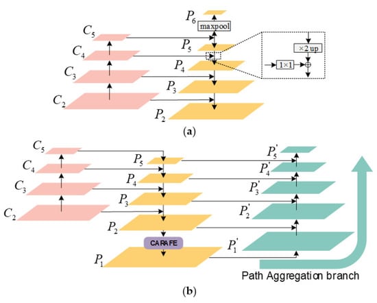 CARAFE. We add an extra bottom level (P1) for better small ship detection. Its size is L/2. P1 can be obtained by × 2 up-sampling or × 2 deconvolution, but we recommend CARAFE []. This is because (1) unlike × 2 up-sampling by bilinear interpolation, which focuses on subpixel neighborhoods, CARAFE offers a large field of view, which can aggregate contextual information; (2) unlike deconvolution, which uses a fixed kernel for all samples, CARAFE can enable instance-specific content-aware handling, which can generate adaptive kernels on the fly [].