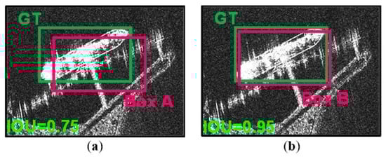 We redesign DH in Mask R-CNN via a cascaded triple structure for a more refined box regression, inspired by Refs [,]. “Triple structure” refers to three parallel branches (a box classification branch, a box regression one, and a mask prediction one). “Cascaded” means that multiple triple structures are connected successively in a cascade. In this way, high-quality boxes can be achieved to enable better mask prediction. The box quality is generally evaluated using the IOU with the corresponding ground truth (GT) [], as in Figure 15. If the IOU threshold is 0.5 (the PASCAL VOC criterion []), Box A and Box B can both detect the ship successfully, but obviously, Box B is better. In particular, the mask prediction of Box B is more accurate than that of Box A. Figure 16 shows the raw DH and the redesigned one.