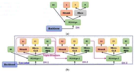 Cascaded. Three triple structures are cascaded successively via connecting the front-end box regressor (B1 → ROIAlign-2 and B2 → ROIAlign-3). Each DH is trained sequentially with increasing IOU thresholds (0.50 → 0.60 → 0.70) by using the output of the front-end DH as the training set for the next. We only set three stages (DH-1, DH-2, and DH-3) considering the trade-off between accuracy and speed. More stages might achieve better performance, but the resulting added parameters slow down the training. Higher IOU threshold at the backend can improve box positioning precision further. Moreover, such progressive resampling can also improve the hypotheses’ quality, guaranteeing a positive training set of equivalent size for all heads and minimizing overfitting []. As a result, the terminal B3 will become tighter than B2 and B1, which can enable more superior mask prediction. Note that the ROI-mode SIS introduced in Section 2 D is only applied to ROIAlign-1 (the input end of the whole DH) because DH should better be injected with modest contextual information; otherwise, too much contextual information existing in the backends (e.g., ROIAlign-3) potentially makes the training unstable. In fact, the above cascaded concept is inspired by Cascade R-CNN [], but Cascade R-CNN belongs to a double structure rather than our triple structure.