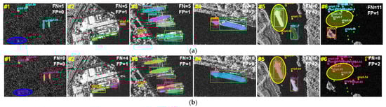 The results on SSDD [] and HRSID [] indicate that SISNet surpasses the other nine competitive methods. (1) Compared with the vanilla Mask R-CNN, SIS-Net improves the detection average precision (AP) by 9.9% and 5.4% on SSDD and HRSID, respectively, and pushes the segmentation AP by 7.3% and 4.1% on SSDD and HRSID, respectively. (2) Compared with the existing best model, its detection AP superiority is 5.1% and 3.3% on SSDD and HRSID, respectively; its segmentation AP superiority is 4.4% and 2.5% on SSDD and HRSID, respectively.