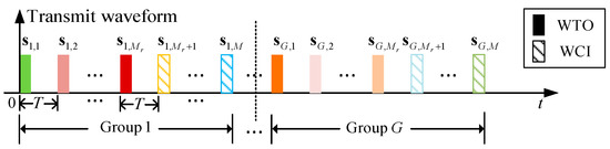 In this paper, we consider that the transmit JRC waveform is the JRC-CWG, as shown in Figure 2. There are groups of JRC-CWGs transmitted in each coherent processing interval (CPI) to perform radar and communications jointly. Each JRC-CWG contains waveforms, and, hence, there are waveforms that will successively be transmitted with a fixed PRI, denoted as in Figure 2. Let be the matrix formed by the waveforms of the -th JRC-CWG. is the -th transmit waveform in the -th JRC-CWG, which is denoted as