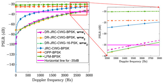 In Figure 7, the relationship between the PSLR and Doppler frequency is shown. The simulation parameters in Figure 7 are the same as those in Figure 6. In accordance with the IEEE 802.11p standard, we assume that the carrier frequency of the JRC waveforms in Figure 7 is 5.9 GHz [46], i.e., the wavelength is 0.051 m. In Figure 7, the horizontal line for −35 dB is plotted. To make sure the PSLRs of the JRC waveforms are lower than −35 dB, the maximum Doppler frequencies and the corresponding radial velocities of the target in Figure 7 are listed in Table 2.