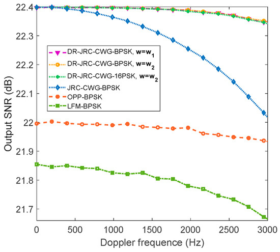 Generally, an ITS often suffers serious clutter. In this scenario, the estimated target output signal-to-noise ratios (SNRs) of the JRC waveforms with different Doppler frequencies are illustrated in Figure 8. The simulation parameters of the JRC waveforms in Figure 8 are the same as those in Figure 7. The SNR is estimated by using the SNR estimation method in [47]. The input SNR of the JRC system is 0 dB in Figure 8. It can be seen that as the Doppler frequency increases, the output SNR of all the JRC waveforms decreases. However, the output SNR of the designed DR-JRC-CWG decreases slower than that of the other JRC waveforms. Furthermore, the output SNRs of the designed JRC-CWG and the DR-JRC-CWG are higher than those of the OPP-BPSK and the LFM-BPSK waveforms when . Hence, the DR-JRC-CWG has the best performance in terms of the output SNR.