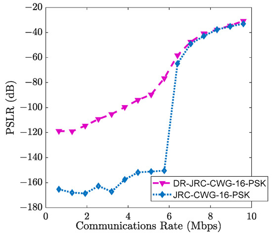 The communications rates of the JRC-CWG and the DR-JRC-CWG are given in (7). It can be seen from (7) that the communications rate of the JRC-CWG or the DR-JRC-CWG will be increased when the number of WCIs in each JRC-CWG or DR-JRC-CWG is increased. Let be a fixed value of 16, the PRI be 25 , and the length of each waveform be 64; the relationship between the communications rate and the PSLR of the designed JRC-CWG-16-PSK and the DR-JRC-CWG-16-PSK is shown in Figure 10. According to (7), the communications rate of the designed JRC-CWG-16-PSK and DR-JRC-CWG-16-PSK is Mbps. It can be seen that for the designed JRC-CWG-16-PSK and DR-JRC-CWG-16-PSK, the PSLR increases as the communications rate or increases. Specifically, when the communications rate is 0.64 Mbps, i.e., , the PSLRs of the designed JRC-CWG-16-PSK and the DR-JRC-CWG-16-PSK are −165.3 dB and −118.8 dB, respectively. When the communications rate is increased to 9.6 Mbps, i.e., , the PSLRs of the designed JRC-CWG-16-PSK and the DR-JRC-CWG-16-PSK are increased to −33.0 dB and −30.7 dB, respectively. Since , the number of WTOs in each JRC-CWG or DR-JRC-CWG will decrease when increases with being fixed. Since only the WTOs are optimized to improve the sidelobe performance of the designed JRC waveforms in the optimization problems (9) and (25), the degrees of freedom of the optimization problems will decrease when decreases, which will lead to a worse PSLR performance. It can be observed that there is a trade-off between the communications rate and the PSLR of the designed JRC-CWG-16-PSK and DR-JRC-CWG-16-PSK. In practice, when designing the JRC-CWG or the DR-JRC-CWG, the trade-off curve in Figure 10 can be used to satisfy the requirements of the PSLR and the communications rate.