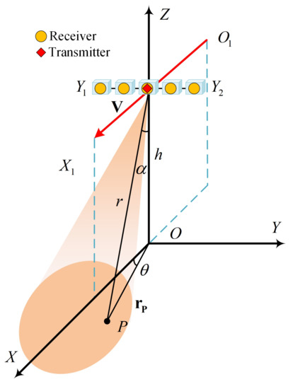 FLMC-SAR is a monopulse radar system. The radar platform moves along the trajectory O1X1 at a speed v and altitude h, which uses a single antenna as the transmitting antenna and a uniform linear array as the receiving antenna; D denotes the length of the real antenna, and d denotes the spacing between antenna elements. The receiver array antenna is symmetrically distributed along the Y-axis over Y1Y2. The imaging area is located directly in the forward-looking area; P denotes a target in the forward-looking imaging area. The radar’s light of sight is defined as a vector pointing from the center of the aperture to the target. The radar’s light of sight can be determined by the beam pointing pitch angle α between it and the Z-axis and the beam pointing azimuth angle θ between the projection of it on the ground and the X-axis. The reference slant range is defined as the distance between the target and the APC at the center of the aperture. With these parameters, the coordinates of the target P in the OXYZ coordinate system can be expressed as