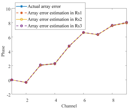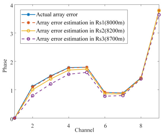 The proposed method converges within ten iterations. Finally, the estimation of the array errors in the range bins , , and are shown in Figure 11. Compared with the actual array errors added into the echo, the estimation of array errors in each range bin are consistent with the array errors, which verifies the effectiveness of the array error estimation. Furthermore, the MSE of the array phase errors is less than . After array calibration, the influence of the array errors on the Doppler ambiguity resolving can be ignored.