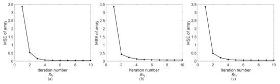 where is the array error estimation. In order to reduce the complexity of the method, the array error estimation is based on the range–azimuth decoupling. Figure 10 shows the MSE of the array errors in the three range bins (, , and where targets are located) after each iteration.