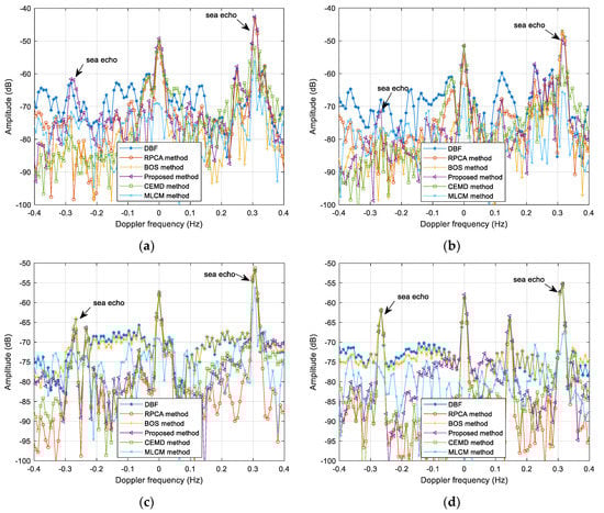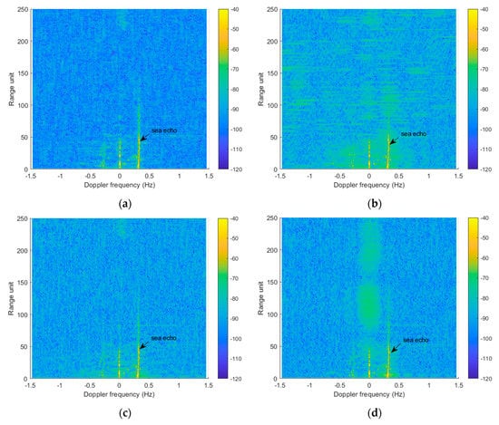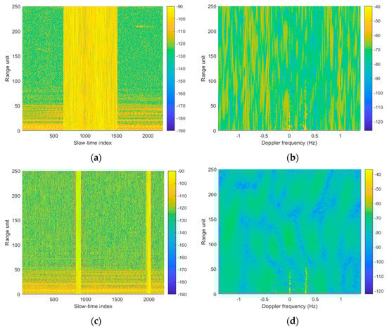 The range−Doppler maps of the LCI−removed results: (a) The RPCA method; (b) The BOS method; (c) The proposed method; (d) The CEMD method.