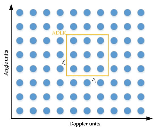 where indicates the test data constructed by vectoring an angle-Doppler local region (ADLR) consisting of three adjacent angles and Doppler units contaminated by the transient interference. and denote the number of the selected angle units and Doppler units in the ADLR. According to [,], and are both set to 3. The ADLR in the compact HFSWR is shown in Figure 2.