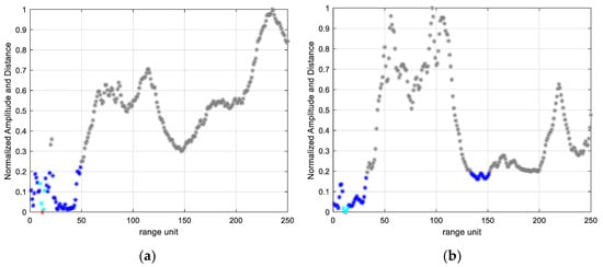 In a HF radar system, the distribution characteristics of interference and clutter are significantly heterogeneous [,]. Based on the above analysis, the mitigation of interference performance depends on the accuracy of the selected training samples, and the SLDs can reflect the homogeneity between the reference unit and test units. When the SLD values are smaller, the homogeneity is stronger. Consequently, the SLDs are first calculated between the reference unit and every test unit using Equation (13) for adaptively selecting the most homogeneous units as training samples. In our proposed method, the number of SLDs should be twice as large as the auxiliary beams for approaching the optimal performance of 3 dB loss. The number of auxiliary beams is set to 21, which was proved in our previous study []. Based on this, 42 training samples with the lowest SLDs need to be chosen. Figure 5a displays the normalized SLD results of LCI where its reference unit is set to the 12th unit and the STD index is the 881th. The reference unit of STI is also set to the 12th unit. The STD index is the 881th corresponding to the left transient interference in Figure 1c. The normalized SLD results are shown in Figure 5b. In Figure 5, the red point denotes the reference unit, the cyan points are the projected units, the blue points denote the selected training samples, the gray points are the heterogeneous units.