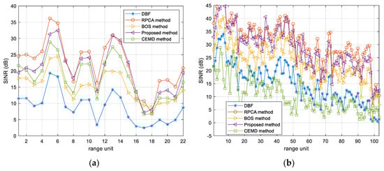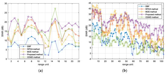 In this way, the output SINRs of STI sea echoes after interference mitigation are shown in Figure 10a,b. Figure 10a displays the negative frequency result, the MSINRs are 11.25 dB, −2.04 dB, 4.78 dB, 2.35 dB corresponding to DBF, RPCA, BOS and CEMD methods, respectively. The range profile of positive frequency is shown in Figure 10b, the MSINRs are 13.46 dB, −2.41 dB, 5.31 dB, 18.28 dB. As shown in Figure 10, our proposed method is also significantly better than DBF, BOS, and CEMD methods, but slightly less than the RPCA method. This is because when transient interferences are sparse in the STD, RPCA can more effectively separate two components of the sparse interferences and low-rank sea echoes. Therefore, while the results are encouraging, it is clear that further work is needed. Potential sources leading to performance degradation are listed below.