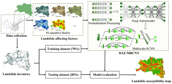 The procedure adopted for the proposed evaluation method to determine landslide susceptibility is illustrated in Figure 1. The constructed network is composed of three parts: selection of landslide susceptibility evaluation factors, construction of a training sample dataset, and susceptibility prediction based on DAE-MRCNN.