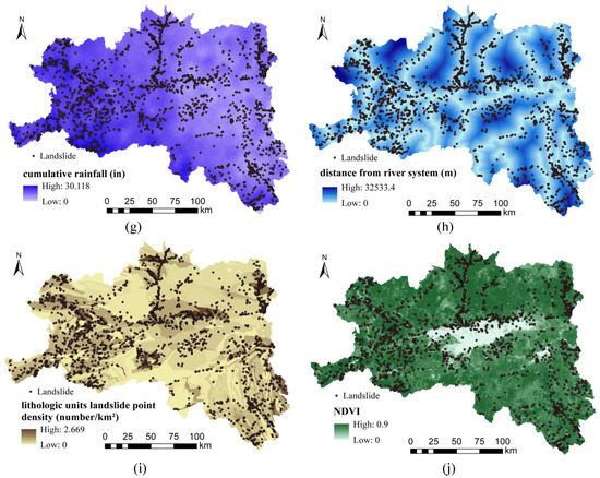(a) DEM, (b) slope, (c) aspect, (d) geomorphologic units landslide point density, (e) distance from road, (f) distance from residential area, (g) cumulative rainfall, (h) distance from river system, (i) lithologic units landslide point density, (j) NDVI.