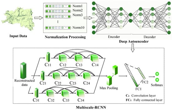 Unlike the supervised CNN, autoencoder (AE) is an unsupervised feature learning neural network that can automatically learn from a large number of unlabeled data samples to acquire the effective features embedded within the data. This technique has been successfully applied to image processing [27,28], pattern recognition [29,30], anomaly detection [31], and so on. Considering the characteristics of AE and the deficiency that the single-scale network structure cannot effectively express the differences among attribute values, this paper proposes a landslide susceptibility evaluation method that integrates deep autoencoder and multi-scale residual networks. The new method makes full use of the data reconstruction advantage of AE along with the classification advantage of CNN networks. The proposed approach uses the organic integration of these two network structures to construct a unified architecture for susceptibility evaluation that can solve the problem of insufficient training samples and makes adequate use of the scale features of evaluation factors to extract more comprehensive discriminative features, significantly improving the accuracy of landslide susceptibility evaluation.