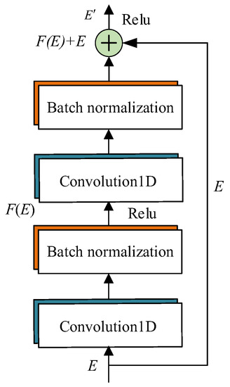 Increasing the network depth of CNN has received much recognition in terms of better results in mining data features. However, this technique also tends to lead to the disappearance of the model learning gradient, resulting in a more difficult learning process. To solve this problem, we introduced a residual network (called ResNet [33]) into the model, which has previously been shown to achieve great success in the field of computer vision. The basic idea of residual learning is to stack multiple convolutional layers together as a block and then use a skip connection scheme to transfer the feature information from the previous layer to the next layer. This scheme allows fitting the residual mapping instead of the original identity mapping as a way to maintain the input information and broaden the propagated gradient. Figure 5 displays the ResNet constructed in this paper, where is the input to the model, and is the output after the linear transformation and activation of the layer, known as the residual.