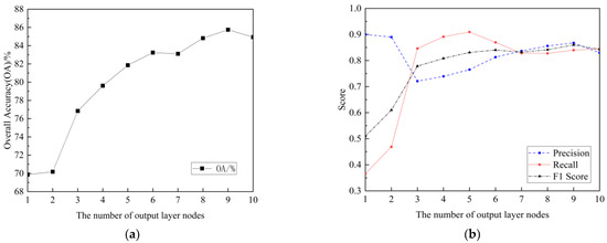 Influence of the number of output layer nodes on the classification result. (a) OA, (b) score.