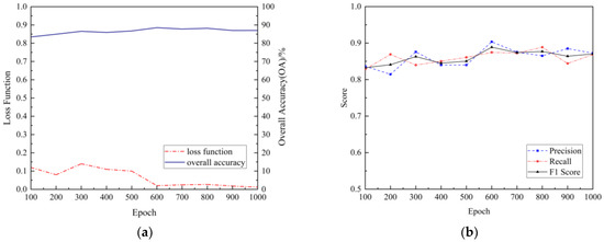 Influence of the different iteration times on the classification result. (a) Loss function and OA, (b) score.