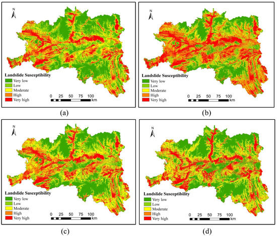 The maps of landslide hazard susceptibility corresponding to the proposed method and other sub-models are depicted in Figure 11. As a whole, the landslide susceptibility zoning obtained by the four models exhibited a certain similarity. The vast majority of the areas were very low susceptibility areas and low susceptibility areas. High susceptibility areas and very high susceptibility areas were mainly concentrated in the central part of Hanzhong City and extended in strips along the east and west directions, primarily along roads and rivers. Most of the moderate susceptibility areas were distributed in strips around the higher susceptibility areas, and a few were distributed around the lower susceptibility areas.