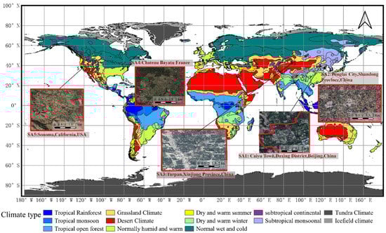 The climate types and characteristics of the five study areas are shown in Table 1. Study area 1 (SA1) is situated in Caiyu Town, Daxing District, Beijing, China. SA1 covers 22.84 km2 and is in a mid-latitude zone with a temperate semi-humid continental monsoon climate [28]. Study area 2 (SA2) in Penglai City, Shandong Province, China spans an area of approximately 21.11 km2. It has a lengthy, cold winter, a rainy, brief spring, and autumn seasons with a pleasant, temperate monsoon climate. Study area 3 (SA3), situated in the northwest Turpan region, Xinjiang Province, China, has a continental desert climate, with less precipitation in drought and hot weather, and higher precipitation in summer than in winter, covering an area of about 21.94 km2. The three study locations are situated in China’s “golden belt” of grape growing, and the agricultural landscape is very fragmented.