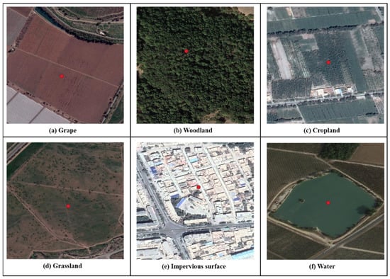 VHR images of (a) vineyards and other landscapes (b) Woodland, (c) Cropland, (d) Grassland, (e) Impervious surface and (f) Water.