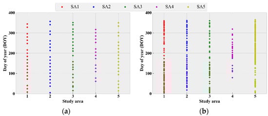 Temporal distribution of all available Landsat-8 (a) and Sentinel-2 (b) images with scene cloud coverage less than 20%.