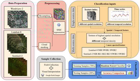 The workflow consists of the following steps: (1) data preparation and pre-processing to create different spatial and temporal resolution images (see Section 3.1 and Section 3.2 for more details); (2) design of classification inputs, where both single-source data and multi-source data are used to identify the vineyard; (3) sample collection; and (4) classification and accuracy assessment (Figure 4).