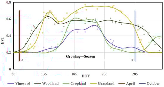 Temporal patterns of EVI for vineyard, woodland, cropland, and grassland. The dots represent the EVI observations of the image, and the lines represent the fitting time patterns. Between the red vertical line and the blue vertical line is the growing season of the vineyard.
