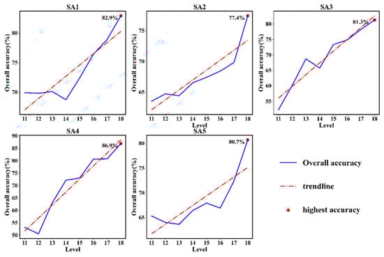 Comparing the AMB of the spatial and temporal features, we find that the AMB of spatial features is within the range of 9.27 × 10−5 to 2.25 × 10−7, the AMB of temporal features is within the range of 1.53 × 10−4 to 3.03 × 10−5, and the former is lower than the latter, which indicates that the accuracy would benefit more from increasing the LoD of temporal features than spatial features of similar data volume. That means the efficiency of the contribution to accuracy from temporal feature changes will be higher than the contribution to accuracy from spatial feature changes. This further demonstrates that the classification performance of temporal features is superior to that of spatial features under this experimental condition.