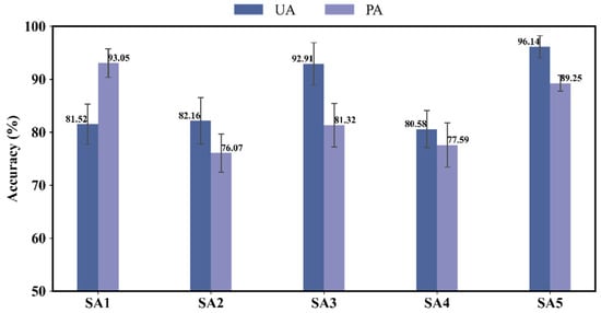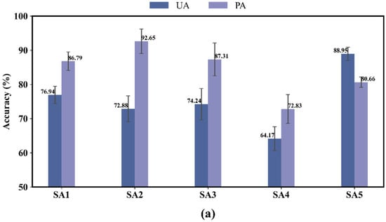 We chose the mapping result with the highest OA for each study area, and the PA and UA for the grape of these maps were around 80% (Figure 10). Sentinel-2 imagery has a higher OA for vineyard recognition than Landsat-8 imagery. The best PA and UA were found in SA5, with SA3 coming in second at about 90%. Overall, the PA is higher than the UA, showing a higher commission error than omission error when employing temporal features to identify vineyards.