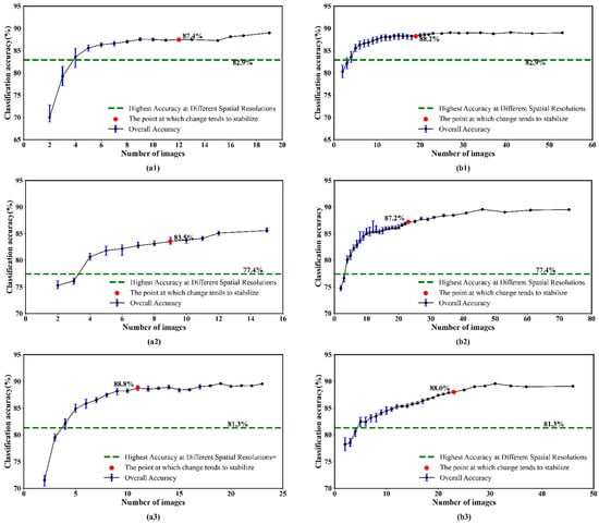 Like the findings from the full-season images, the OA increased with the number of growing season images in the time series of inputs, and the uncertainty decreased (Figure 12). The green lines in Figure 9 represent the optimal accuracy achieved using spatial features extracted from WV-2 imagery only, and these accuracies can be reached using a shorter Landsat-8 or Sentinel-2 growing season series. In most of the study areas, the shortest growing season time series includes less than three images to reach the highest classification accuracy using spatial features (three images for SA1 and SA2, two images for SA5, and three Landsat-8 or four Sentinel-2 images in SA3). During feature changes, we can use images from shorter growing season time series to obtain similar results to the full season time series. Generally, three growing season images may be used as a substitute for five images, which can also obtain a comparable mapping performance to the best level that can be achieved with spatial features.