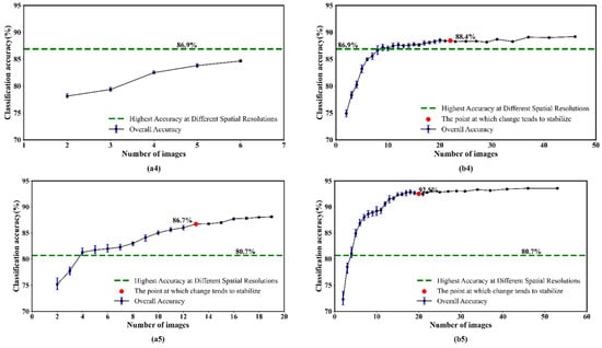 The relationship between the number of Landsat-8 (a1–a5) or Sentinel-2 (b1–b5) images as inputs and the OA for the five study areas.