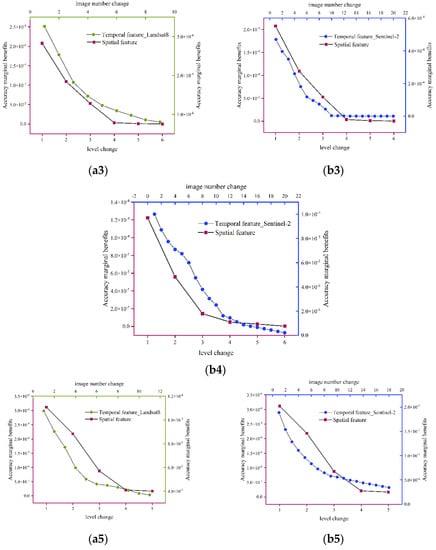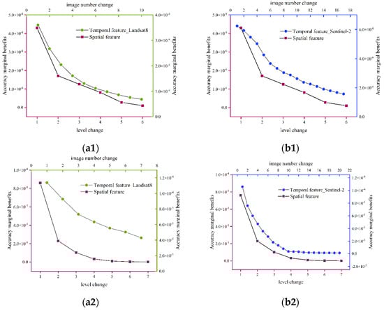 From Figure 11, we can see that the accuracy marginal benefits (AMB) decrease gradually with the degree of feature variation. For the spatial features, we mainly calculate the AMB when the resolution is increased from Level 11 to Level 18. The AMB decreases as the spatial resolution increases. In other words, although the accuracy of VHR images is high, the contribution to the accuracy improvement decreases by increasing the unit pixel value. Similarly, for the temporal features, we mainly calculate the AMB for the time series length (two images) growing up to the stable point of the time series length (Figure 9 red point). The AMB also decreases gradually as the time series length increases. The AMB of Landsat-8 is higher than that of Sentinel-2 by about 7.2 × 10−5.