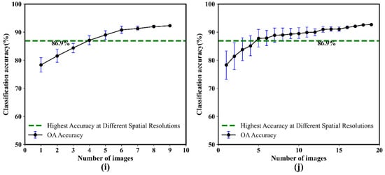 The relationship between the number of growing season images and OA in five study areas, where (a,c,e,g,i) are the results obtained using Landsat-8 images, and (b,d,f,h,j) are the results obtained using Sentinel-2 images.