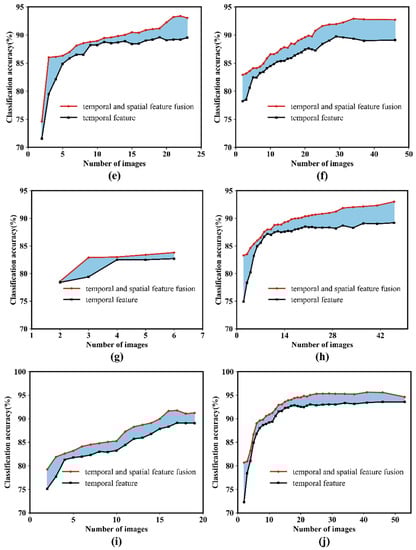 In the above study, we mainly considered time series distribution over the whole season, ignoring the superiority of images acquired during the growing season in the identification. Therefore, it is important to explore the influence of the temporal distribution of the images in the time series on the complementary relationship of spatial and temporal features. The distribution of image numbers acquired in the growing season is shown in Table 6.