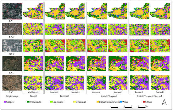 Since the remaining multi-spectral bands were not used in the previous experiment, we attempted to add multi-spectral bands to the time series and fuse them with the spatial features. We based them on the length of the time series whose accuracy tends to stabilize with the change of temporal features. We note that combining temporal features of time series that incorporate multi-spectral with spatial features can obtain a better result (Table 7). In SA5, the OA of using the temporal features of time series that add Landsat-8’s multi-spectral data is improved by around 4–7% compared to the original time features only, and for Sentinel-2, the OA is improved by about 2–4%. Overall, the classification accuracy of Landsat-8 images improved more significantly than that of Sentinel-2 images after adding multi-spectral features.