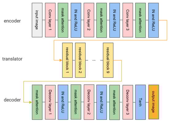 The GMA-CycleGAN generator adds mask attention between the convolutional layers, the instance normalization (IN), and the ReLU activation layers of the original CycleGAN encoder and decoder. As shown in Figure 4, among them, the encoder uses three convolutional layers to extract the feature maps of from the source image of , and then the translator translates the dimension feature maps extracted in the previous step into the dimensional feature maps of the target image through nine residual blocks. Finally, the decoder uses three deconvolution layers to restore the low-level features from the feature maps so as to output a image. To maintain the symmetry of the CycleGAN generator, in the encoder, we insert the mask attention module after the initialization convolutional layer (kernel size equal to and stride equal to one), and after two down-sample convolutional layers (kernel size is equal to and stride is equal to two), other structures are the same as the original CycleGAN, and then the corresponding improvements are added symmetrically to the decoder. Since the CycleGAN model is mirror-symmetric, the mask attention module is placed after the convolution operation when encoding and before the deconvolution operation when the feature is decoded.