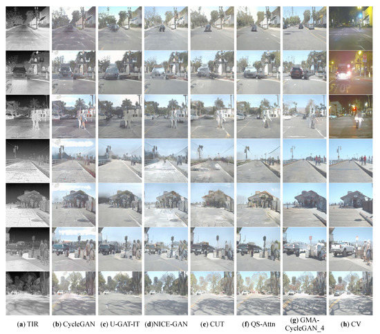 To sum up, we provide three nighttime TIR images, four daytime TIR images, and their corresponding translated CV images to subjectively evaluate the different models, as shown in Figure 5. Since all models in Figure 5 were trained with the unpaired dataset, in which daytime CV images accounted for the majority (about 80%), these models can easily translate the night images into the day images; this does mean these models are overfitted for the night image translation; however, the loss curves did not show overfitting during the model training. In fact, in order to obtain better RGB visual effects, we expect to translate all these TIR images into day images regardless they were captured at day or night. In the future work, we consider to supplement extra information to augment the translation effect from night TIR images to day CV images.