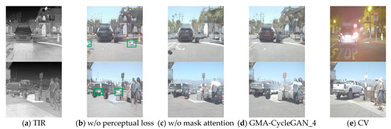 Table 3 displays the quantitative evaluation metrics of different ablation studies for GMA-CycleGAN_4. The translated TIR images produced by GMA-CycleGAN_4 with full structures achieve the best quantitative metrics. The lack of perceptual loss and mask attention causes performance degradation, in which omitting perceptual loss reduces the FID, PSNR, and SSIM by 2.66, 1.07, and 0.0086 and omitting mask attention reduces the FID, PSNR, and SSIM by 2.02, 0.92, and 0.0062.